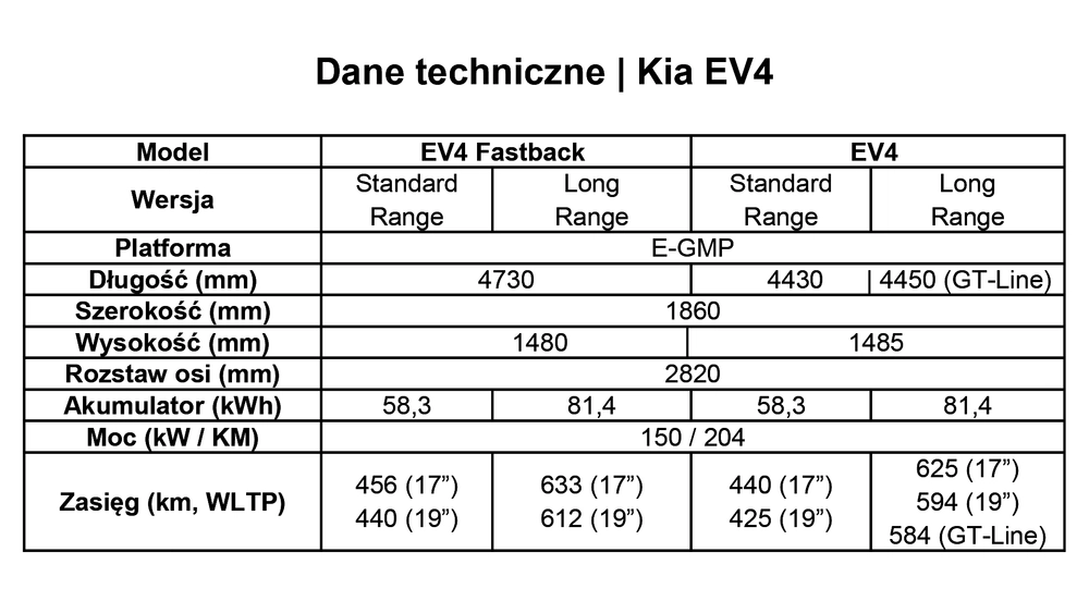 EV4 do pierwszego elektrycznego hatchbacka marki Kia, skonstruowany na pokładzie Electric Global Modular Platform (E-GMP). Model dziesięć zapewnia i osiąga i osiąga poziom w występach samochodów. Produkowane w Żylinie na Słowacji, EV4 z akumulatorem, który może zmagazynować 81,4 kWh energii elektrycznej, która od 10 do 80 procent może być używana w zaledwie 31 minut, zapewnia zasięg w cyklu mieszanym WLTP do 625 km.